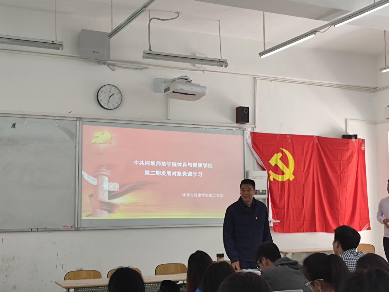 【本网讯】根据《中共阿坝师范学院委员会党校举办第二期培训班的通知》精神,为教育引导培训对象牢记党的百年奋斗重大成就和历史经验,深刻认识“两个确立”的决定性意义,增强“四个意识”、坚定“四个自信”、做到“两个维护”,弘扬伟大建党精神,深入学习贯彻习近平新时代中国特色社会主义思想,不断强化思想理论武装,切实做好发展对象集中教育培训工作,2022年5月4日中午12:30,体育与健康学院党委在C教学楼101教室组织了第三次党课学习,由学院党委书记陈松同志向体育与健康学院第二期预备党员、第二期发展对象和第十四期入党积极分子等学员进行授课,第二委员陈豪同志主持。