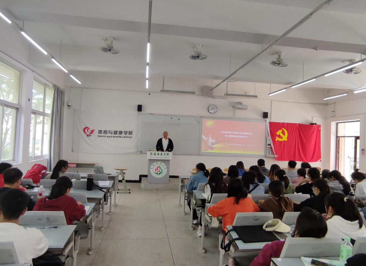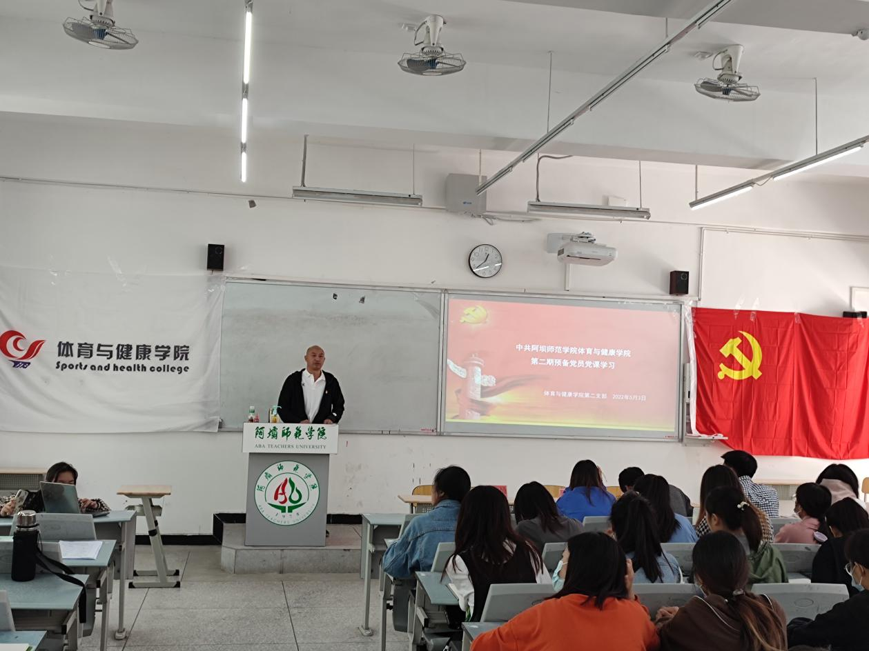 【本网讯】根据《中共阿坝师范学院委员会党校举办第二期培训班的通知》精神,为教育引导党员发展对象牢记党的百年奋斗重大成就和历史经验,深刻认识“两个确立”的决定性意义,增强“四个意识”、坚定“四个自信”、做到“两个维护”,弘扬伟大建党精神,深入学习贯彻习近平新时代中国特色社会主义思想,不断强化思想理论武装,切实做好集中教育培训工作,体育与健康学院党委于2022年5月2日中午12:30,在C教学楼101教室召开了党课教育活动。由体育与健康学院党委副书记、院长龙正印同志为第二期预备党员、第二期发展对象和第十四期入党积极分子等人员进行授课,第二支部书记付文灿同志主持。