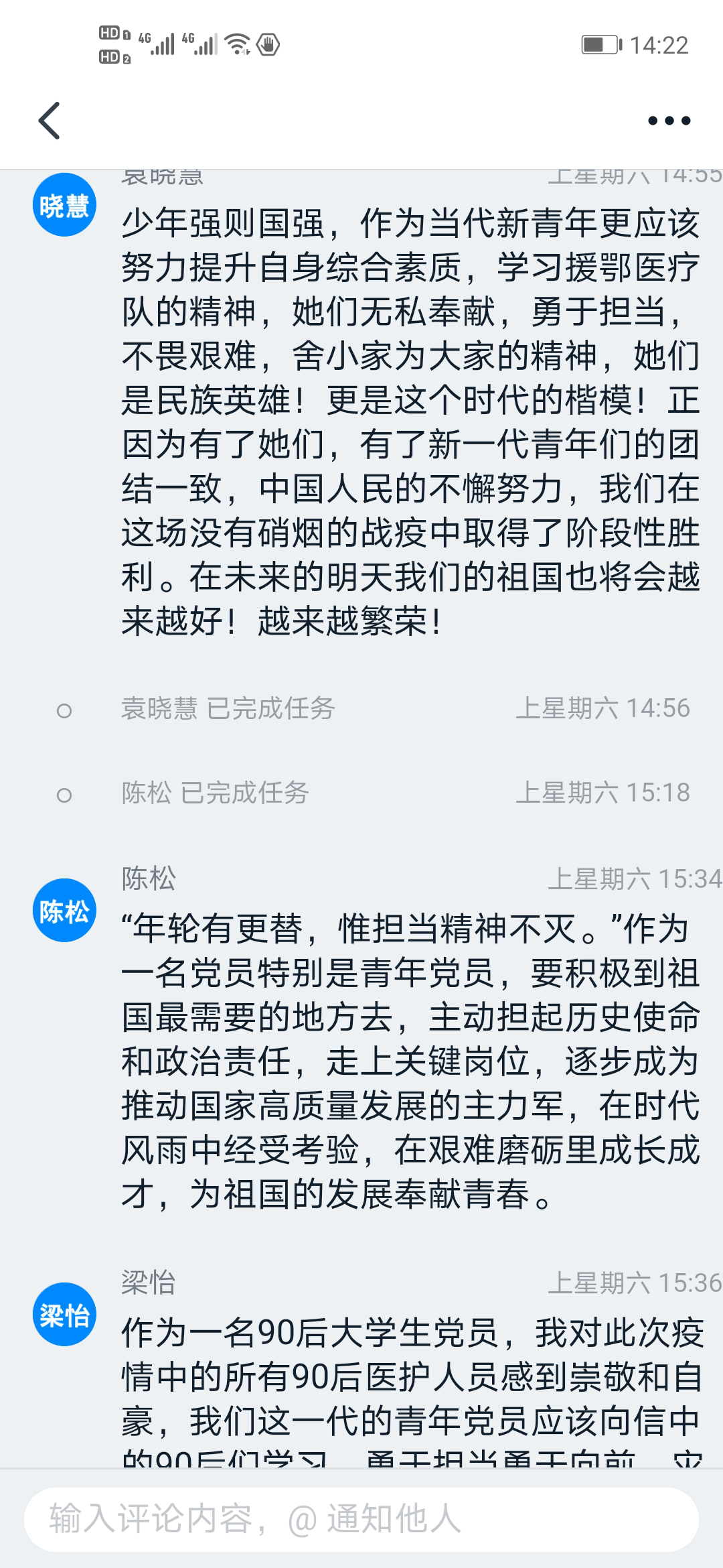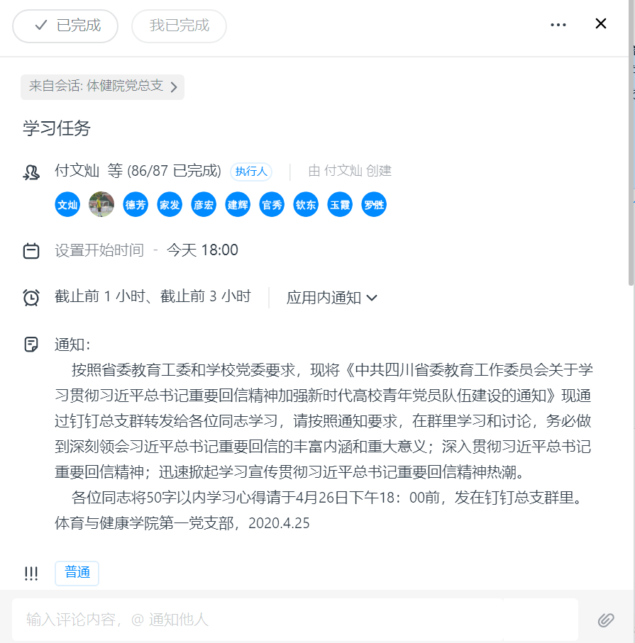 【本网讯】根据党委组织部安排,体育与健康学院党总支第一党支部于2020年4月25日至28日开展了学习《中共四川省委教育工作委员会关于学习贯彻习近平总书记重要回信精神加强新时代高校青年党员队伍的建设通知》的活动。学习活动采取通过将《通知》和《习近平总书记给北京大学援鄂医疗队全体“90后”党员的回信》原文上传支部钉钉群供全体党员学习,党员同志学习后在群里积极发言交流学习心得的方式进行。