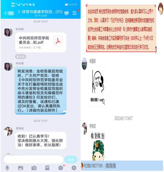 【本网讯】根据阿师院委〔2020〕2号《中共阿坝师范学院委员会关于在打赢疫情防控阻击战中充分发挥全校基层党组织战斗堡垒和党员先锋模范作用的通知》文件精神和阿师委组〔2020〕17号《关于在疫情防控期间严肃党支部组织生活和发展党员工作的通知》文件精神,体育与健康学院党总支积极落实相关要求。
