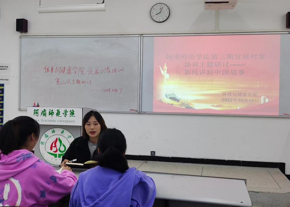 【本网讯】根据体育与健康学院第二党支部的安排,体育与健康学院第三期发展对象培训主题研讨会在2022年10月17日早上8:00在树人楼F103开展,主要内容按照主题如何讲好中国故事开展研讨,表达自己的观点和见解。会议由孙德桃同志主持,要求每位同志切身谈谈实际的想法和意见。