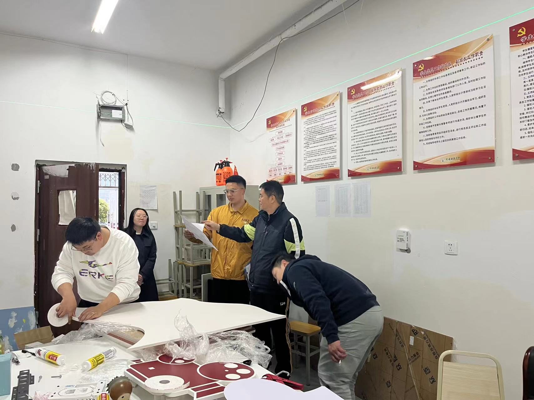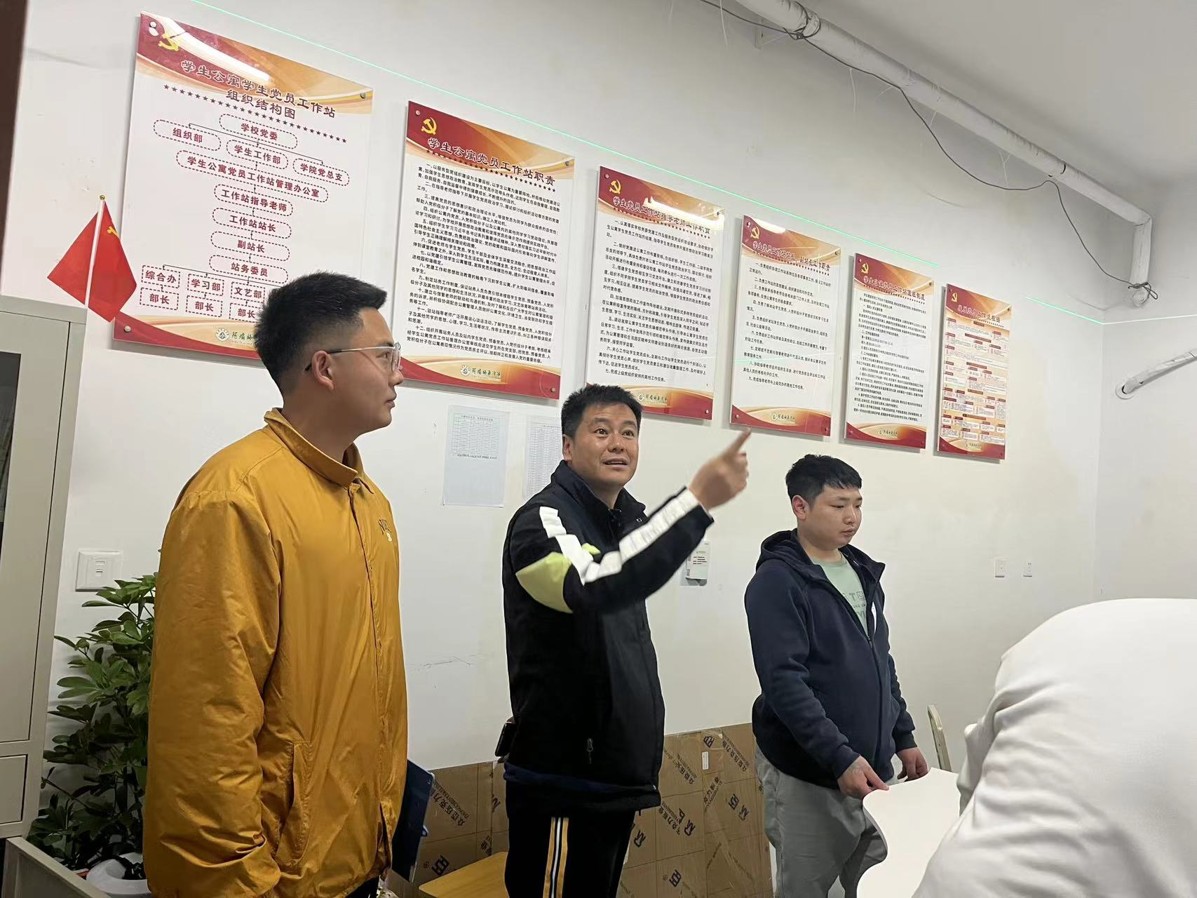 【本网讯】4月9日晚上七点,体育与健康学院党委书记陈松、八栋党员工作站第一指导老师付文灿、第二指导老师金玉洁,到党员工作站指导工作并到宿舍检查学生寝室卫生。