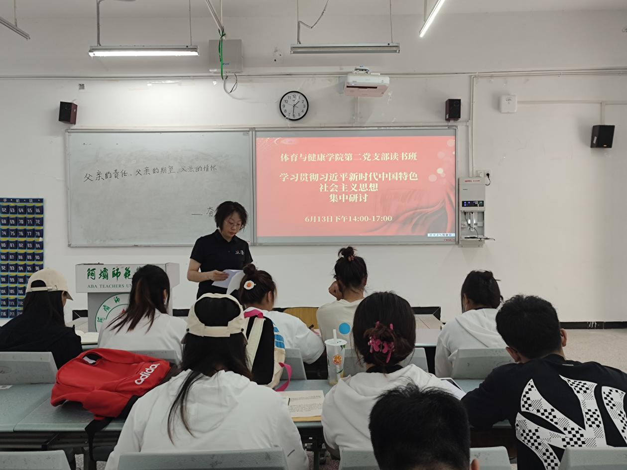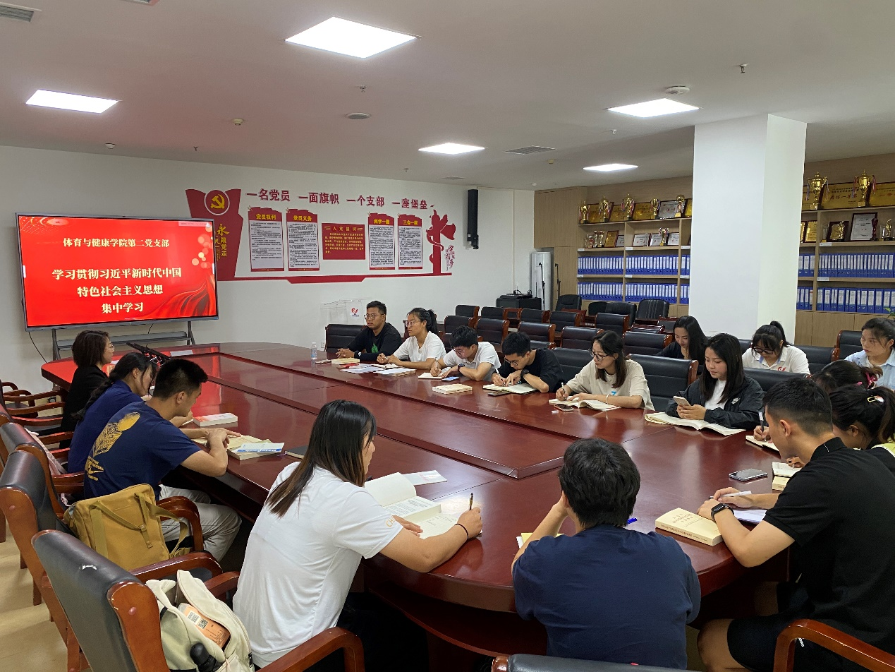 【本网讯】体育与健康学院第二党支部于2023年6月6日-13日举办学习贯彻习近平新时代中国特色社会主义思想主题教育读书班。本次主题教育读书班主要学习任务是原原本本学习党的二十大报告、党章、《习近平著作选读》、《习近平新时代中国特色社会主义思想专题摘编》4 本重要书目,通读精读《习近平新时代中国特色社会主义思想学习纲要》、习近平总书记《论党的自我革命》、《习近平新时代中国特色社会主义思想的世界观和方法论专题摘编》《习近平关于调查研究论述摘编》4 本书目。读书班采取集中学习、个人自学、观看学习视频、研讨交流4个环节。第二党支部全体党员参加。